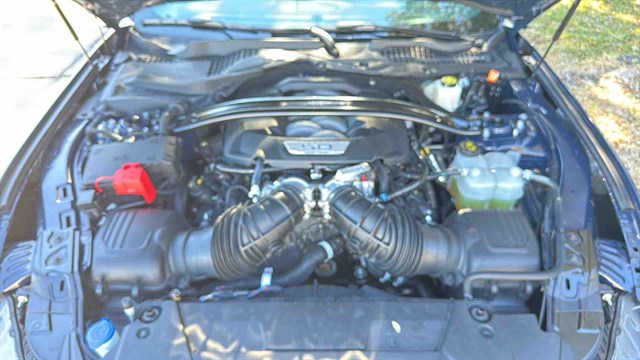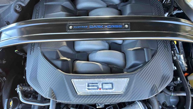 The Dark Horse Package is highlighted by a 5.0-liter V8 engine (500 hp, 418 lb-ft), Active exhaust, High-performance braking system, Additional oil coolers, MagneRide adaptive suspension, Special exterior styling and badging, 12-speaker B&O audio system, Ford Co-Pilot360 (Blind-spot warning with rear cross-traffic warning (alerts you if a vehicle is in your blind spot during a lane change or while in reverse),, Forward collision warning with automatic braking (warns you of an impending collision and applies the brakes in certain scenarios), Lane keeping assistance (steers the Mustang back into its lane if it begins to drift over the lane marker), Rear parking sensors (alert you to obstacles that may not be visible behind the vehicle when parking), Wireless smartphone charging pad, Multi-color ambient lighting, Auto-dimming rearview mirror, Heated steering wheel, Combined instrument and infotainment displays, Leather-wrapped steering wheel, LED headlights, Digital instrument panel, 13.2-inch infotainment touchscreen, Apple CarPlay/Android Auto smartphone compatibility, and Wi-Fi hotspot.