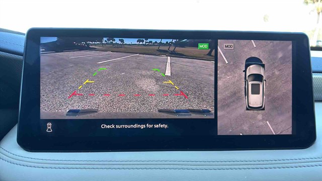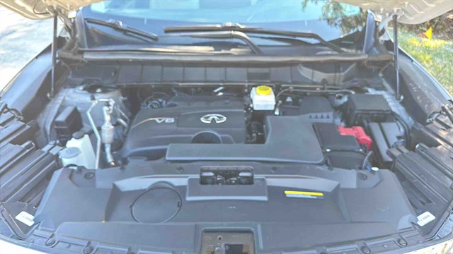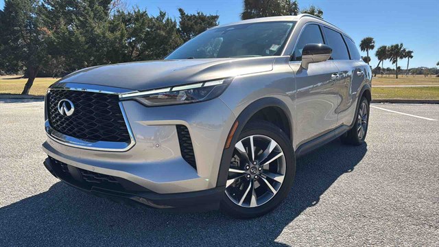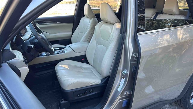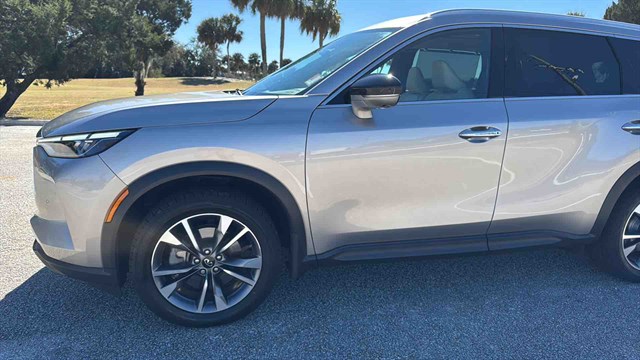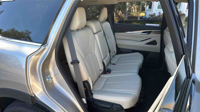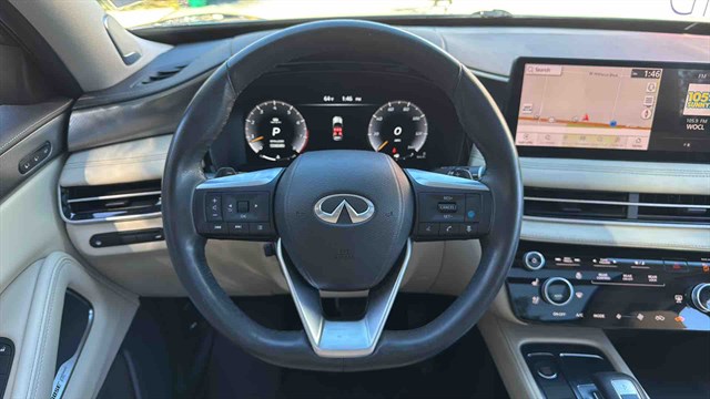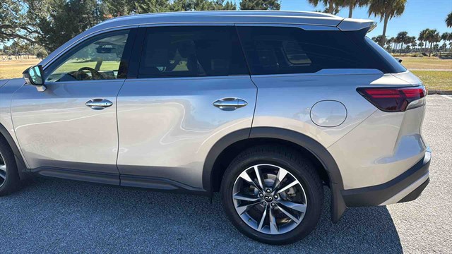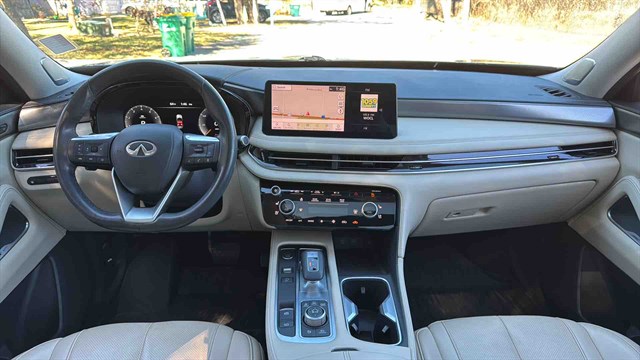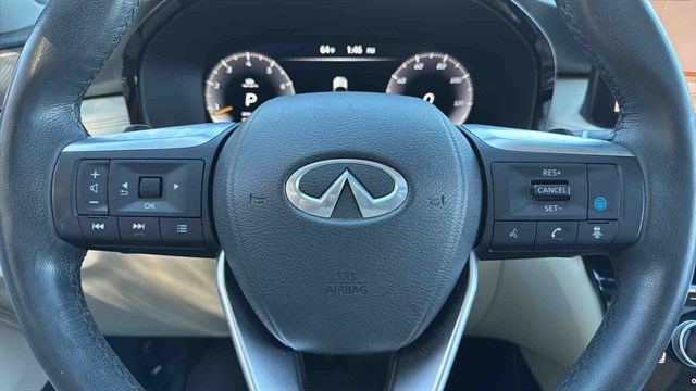 Highlighted by 20-inch wheels, Front/rear parking sensors, 360-degree camera system (gives you a top-down view of the QX60 and its surroundings for tight parking situations), 12.3-inch digital driver's display, Rear side window manual sunshades, Front ventilated/heated seats, Power-adjustable steering wheel, Navigation system, , Leather upholstery (first and second rows), LED headlights, Panoramic moonroof, Power liftgate, Heated steering wheel, 12.3-inch center touchscreen, Apple CarPlay/Android Auto integration, Wireless smartphone charging pad, High-beam assist, Adaptive cruise control (maintains a driver-set distance between the Infiniti and the car in front and can react to traffic signs and set speed), Lane keeping system (makes minor steering corrections to help keep the vehicle centered in its lane), Lane departure mitigation (warns you of a lane departure when a turn signal isn't used and can automatically steer to maintain lane position), Traffic sign recognition, Driver attention warning (issues an alert if sensors determine you are becoming fatigued), Blind-spot intervention (automatically steers the car back into its lane if you try to change lanes while a car is in the vehicle's blind spot), Rear cross-traffic warning (alerts you if a vehicle behind you is about to cross your path while you're in reverse), and Rear automatic braking (applies the brakes automatically to avoid an imminent collision with an object behind the vehicle).